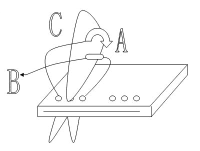 2、把预先按估计剪下来的线(11-15CM),取一根,AB两端中间对折又有了C端(C端是一个倒V形的双线端头),把A、C、B三端按从左到右顺序从三个眼中穿过书的另一侧(C端从中间的眼穿过),穿过去后在另一侧把过来的A、B两端从C端(双线头的倒V形中)中间交叉穿过,用钳子夹住A、B两个线头用劲一拽 (用手拽也行,我是为了省力高效就用手钳),就凑得很紧了,把A、B端再打个结,把多余的线头剪掉就可以了。(由于线细而用电钻钻的眼很齐,不用钩针线一穿就过了。)这是常用的一种财务装订法。(见图)(注意点就是从封一向封四穿,这样把线的结就留在了封四即背面)