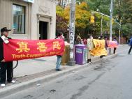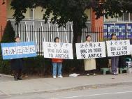 时值下午下班高峰时间,法轮功学员鲜艳的横幅和醒目的标语在阴雨的天空下显得格外引人注目,引起了众多路人和过往车辆的注意,纷纷向学员询问情况,索要法轮大法资料,了解真象。很多车上的人们都侧目观看,也有人摇下车窗,伸过手来索要资料。也有很多华人路过的时候,看到“法办江罗刘周”的字样时都不由感到震动,有的还露出会心的微笑来。