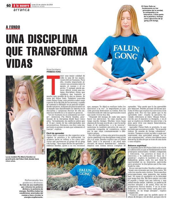 修炼法轮大法已有五年的琵雅-玛莉雅-珊达斯(Pia-Maria Sandas)说:“人不光有身体。”她解释道:“目前医生们了解到,百分之七十的疾病是身心失衡造成的。这表明,突破我们的身体作思考是何等重要。”