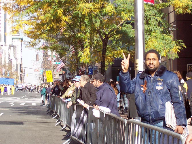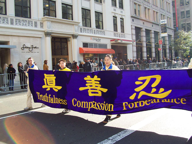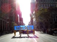 当天天气转暖,中午时分,太阳也露出了笑脸。老兵日游行是曼哈顿盛大游行之一,今年是第59届;有114个团体、约1万7千人参加;估计有超过10万的观众。游行队伍在曼哈顿著名的第五大道上行进。1百多位穿着黄色炼功服的法轮功学员在长长的队伍中格外显眼。
