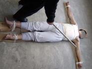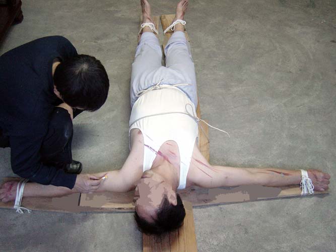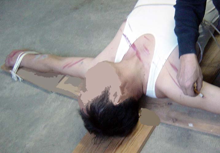 2004年2月份,七监区李凤江指使犯人将大法弟子赵玉安、金生 、关兆起三人,先后扒光衣服,绑在横竖交叉的20公分宽、两米长的两条木板合成的十字架上,然后扔在厕所的地上,门窗打开,任恶徒任意毒打,打昏过去,再用冷水泼醒。其间用烟头烧,用皮管子抽,不准睡觉,昼夜折磨,迫害写五书。不配合的就折磨下去,使之欲生不得,欲死不能。