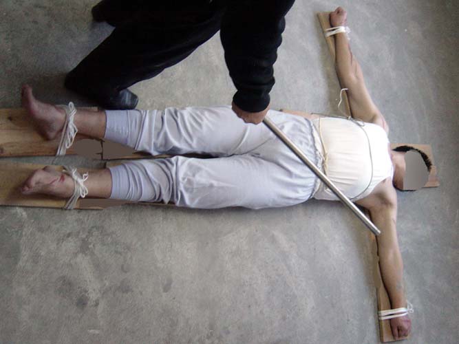狱警指使犯人把李力壮肋骨打断,在严冬里扒光衣服,强行把他按到水里浸,用力往下拽小便,用劲捏睾丸;反复浸、打、“数肋巴”,长时间塞进冷水缸中浇冷水;将橡胶管插入肛门中,往里灌凉水,灌一会看不行了,再由两个犯人拖着他赤裸的身体在地上遛。之后再进行迫害。精神侮辱、肉体折磨使李力壮痛不欲生。