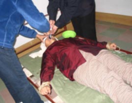 如果再不向邪恶妥协,就被强行上“抻床”,恶徒用四个环把大法弟子的手脚固定在床上,四个环可以“上劲”,不断上劲,身体抻起悬空,抻得胳膊、腿的关节、筋骨都脱离,象五马分尸一样疼痛难忍,几秒钟人就疼得昏死过去。持续几分钟,胳膊、腿就残废了,连爬动、穿衣服都不能。受过这种酷刑的大法弟子很多,有些学员实在承受不住痛苦,被迫违心的向邪恶妥协。