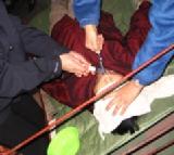 大约在代表团离开饭店15分钟前,一个警察对法轮功学员说:“你们得自己解决你们之间的事。”于是警察开始离开公园。还没等警察完全离开,那些中国人就开始动手撕抢横幅了,并用刀子割横幅。4名阿根廷学员为了保护横幅受到殴打和推撞。横幅都被抢走了,没被抢走的一个也被割破了。