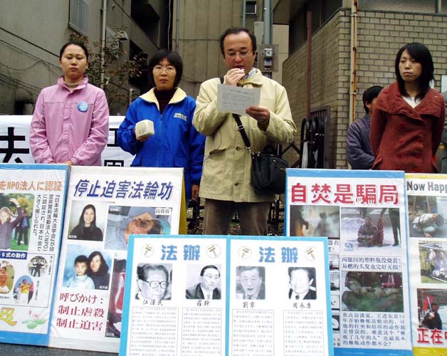 日本学员大阪中领馆前呼吁法办江罗刘周(图)