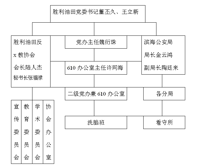 胜利油田的正式名称是胜利石油管理局,是中国石油化工总公司的一个下属企业,胜利油田的邪恶之徒在迫害镇压法轮功方面,秉承邪恶之首江××的旨意,不遗余力,坏事做绝,毒害人之深,在中国的土地上也是屈指可数的。为镇压法轮功,迫害大法弟子,毒害众生,胜利油田建立了一整套完善严密的组织机构。现将这套由邪恶之徒把持的邪恶机构公布于众。