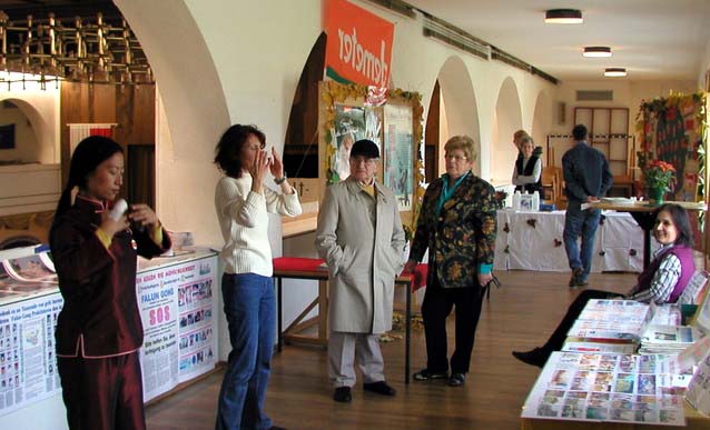 一名记者在功法展示时拍下法轮功的信息展位。2003年11月25日,这张照片登在Bayerwald-Echo报。