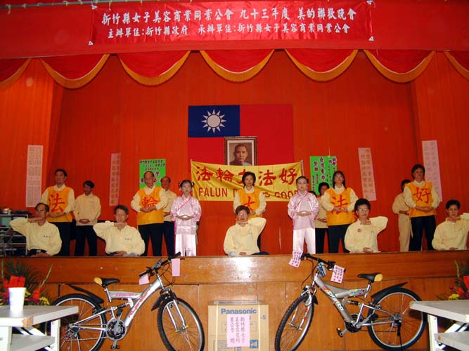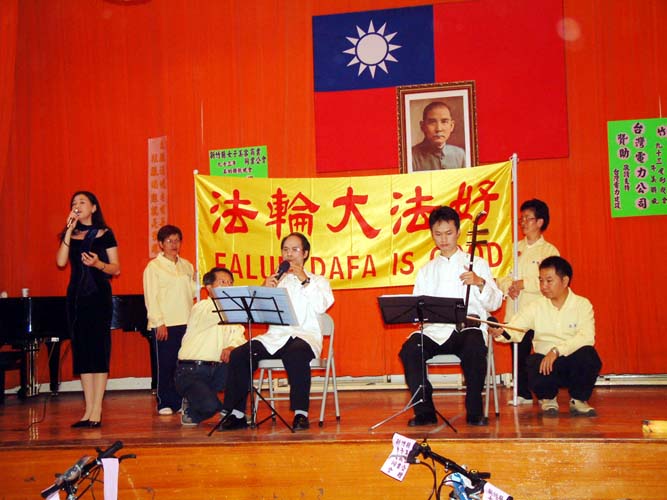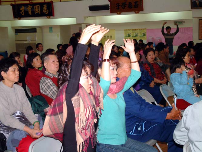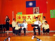 晚上7点,主持人为联欢会揭开序幕,第一个入场的就是法轮功功法表演,功法展示过程中,为了让大家从各方面了解法轮功,一位学员在台上为在场人士介绍法轮功的“真善忍”的法理并跟来宾分享从做一个好人进而达到身心健康的修炼内涵。台下的民众也有人热情的当场跟着学炼起来,与台上学员表演相互辉映。