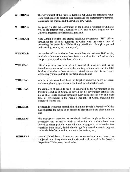 鉴于,中华人民共和国政府已禁止法轮功学员实践他们的信仰,并且系统的试图铲除该功法及其修炼者;并且,