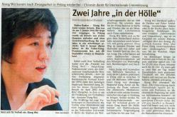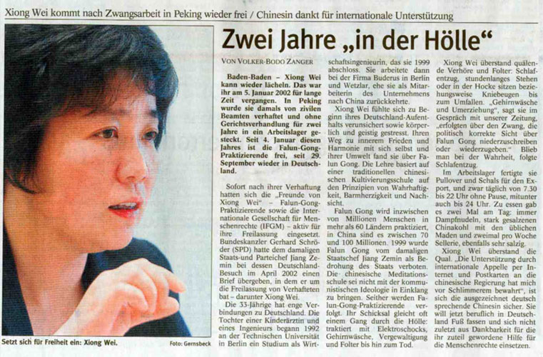 【明慧网2004年11月30日讯】法轮功学员熊伟因散发法轮功真象传单在北京街头被捕,后被非法劳教两年,德国巴第施日报刊登了题为“两年的‘地狱’生活”的文章,披露了熊伟在劳教所受到的各种非人的虐待。