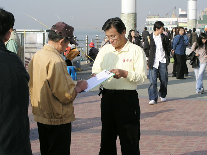 因为月尾岛是旅游观光地区,来了很多外国观光客,其中在韩国的中国学员担负了向中国人讲真相的重任。因为展板前云集的人太多,很多学员把自己讲解的位置让给了游人。