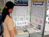 展位现场放置许多法轮大法简介、真象光碟、洪法书签等资料供民众索取,很多游客争相索阅。本身也学炼法轮功的慧灯中学洪校长,主动帮忙布置会场;一位陈校长表示,希望下次能有机会观赏法轮功功法表演;另一位黄姓首长明了法轮功真象后,直言谴责大陆江氏集团太可恶了,不该镇压这群学法轮功的好人。