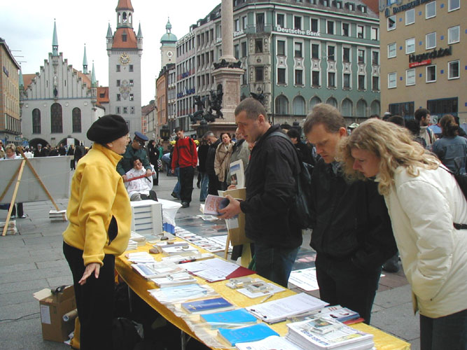 【明慧网2004年11月9日】2004年11月6日,来自德国帕索(Passau)、累根斯堡(Regensburg)和慕尼黑(Muenchen)的法轮功学员聚集在慕尼黑玛琳广场(Marienplatz),举行了包括功法表演、信息咨询、图片展出和模拟酷刑在内的系列活动。国际人权组织(IGFM)缇拉克先生(Thierack)以及不久前从国内被营救回来的柏林法轮功学员熊伟也参加了活动。