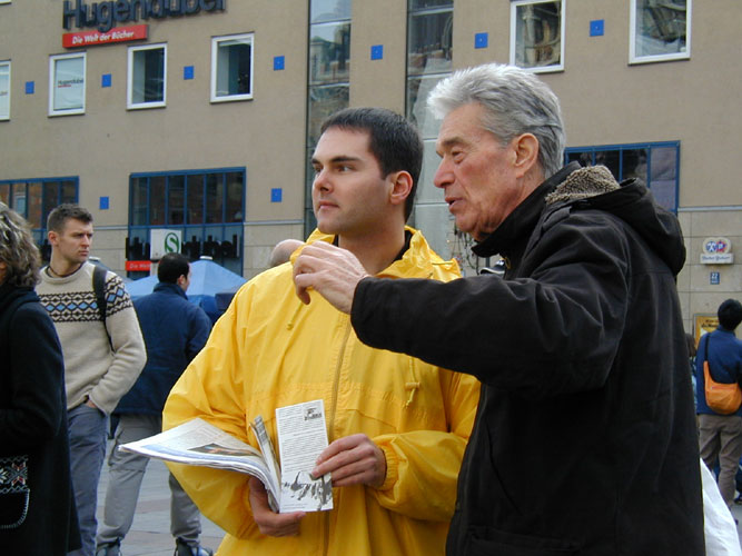 有一位德国女士告诉法轮功学员,她有一个画廊,最近有两位中国人要来办画展,她想让他们了解真象,她跟学员要了中文报纸,她希望会有很多的中国人来观看画展并了解法轮功真象。