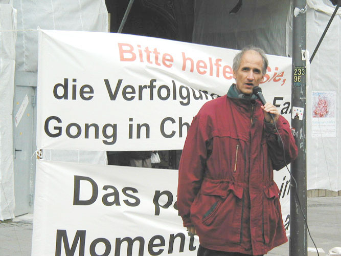 国际人权组织缇拉克先生在集会上对中国的人权现状進行了谴责,同时呼吁听众签名支持法轮功学员,并告诉大家,营救熊伟的成功有很大一部分靠了德国民众的签名支持。