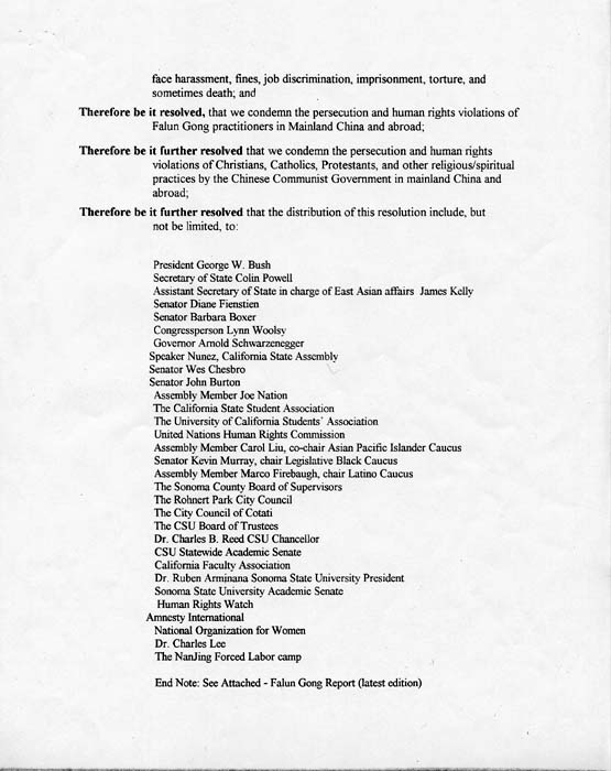 鉴于,2003年美国国务院的年度人权报告中指出,[中国]公安经常使用极端手段对待和平的在押法轮功学员,其中包括老人及携幼者。学员们面临骚扰、罚款、工作方面的歧视、监禁、酷刑,甚至虐杀;