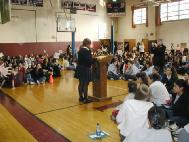 2004年12月9日星期四,几位西人法轮功学员应邀来到了中学。中间休息时间,所有的学生来到了体育室。贝德福德小姐介绍了法轮功和在中国发生的迫害,并请法轮功学员表演功法。