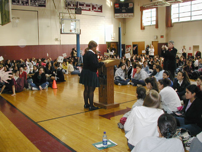在提问中,一个学生问及她在曼哈顿看到的酷刑展,一位学生问及能否写信给总统布什要求帮助,一个学生问及奴工问题。教师库能女士向学生提议写信给中国的领导人,她说“想象中国领导人收到400封来自美国纽约的中学生的来信要求释放李祥春。”大厅里报以会心的笑声。