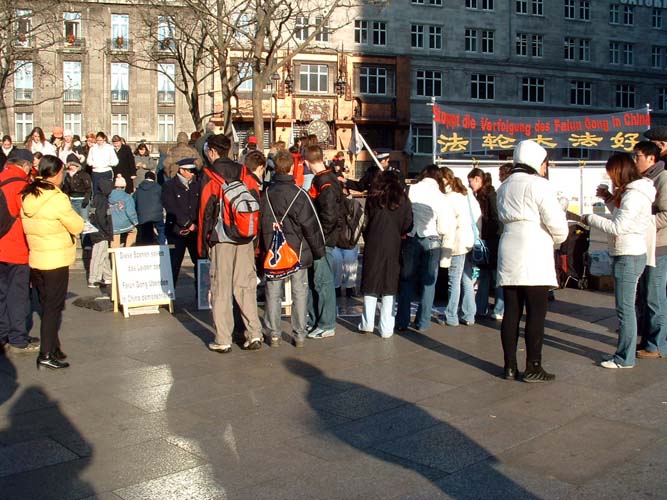 【明慧网2004年12月14日】德国科隆大教堂前每天都能看到非常多的中国旅游团,一转眼,我们在科隆教堂前设立的全周讲真象展点已经顺利运作四个月了。進入十月,参与讲真象的大学生弟子们都要开学了,原本都以为展台要撤掉了,但是在与老学员密切的交往,互帮互助下,新学员积极努力,在法理上理解得非常快,在学法只有半年或几个月的情况下,挑起了周一至周五讲真象的大梁。