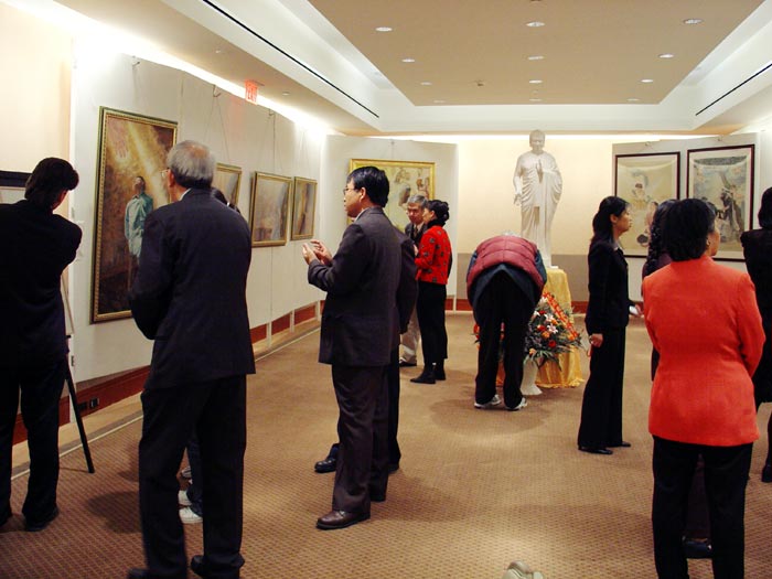 在酒店二层华盛顿和汉密尔顿大厅,参观者有幸观赏画展。“坚忍不屈的精神”画展陈列在汉密尔顿大厅,正中是著名雕塑家张昆仑的作品——佛像,大厅四周陈列着15幅作品,主要是油画和粉蜡画。画家汪卫星、王志平专程赶到波士顿参加画展,其中展出了他们的作品共9幅。