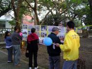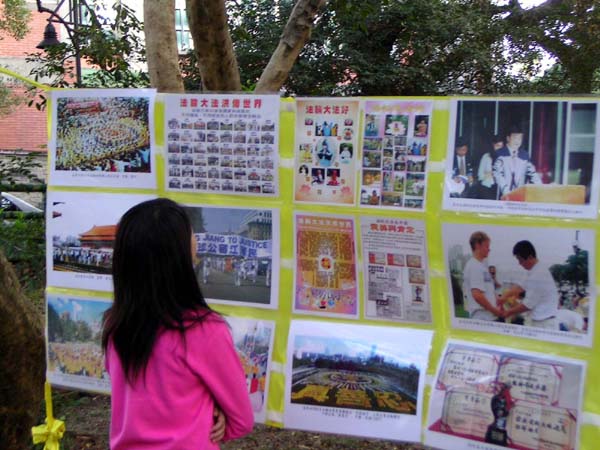 有位老先生在看板前,看了好一段时间了都不愿离去, 当学员上前问候他时,他愉快的叙述着:“这个功法我知道,人家炼的都说好!”当他看到内地残暴的对待这些修炼人时,一反他先前平顺的口吻大声的说:“共产党没道理,人家炼的好好的,受益了,却见不得人家好!真是没道理!”最后他将资料带走,不断的跟学员致谢着。一阵一阵的民众经过时,总是会自动的停下脚步来看看大法看板的内容,很自然的就对法轮大法有了基本的认识。
