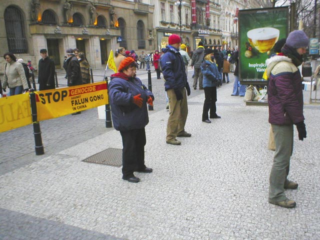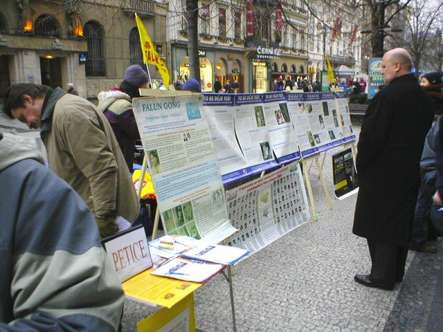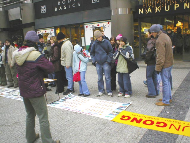 【明慧网2004年12月20日讯】2004年12月11日星期六,法轮功学员在捷克首都布拉格市中心讲真象,以使民众了解并关注五年来在中国江氏集团对法轮功進行的群体灭绝迫害。由于前一天为世界人权日,因此这也是一个分送简介及讲真象的好机会,让人们明白在中国的一亿法轮功学员所遭受的大规模迫害真象。