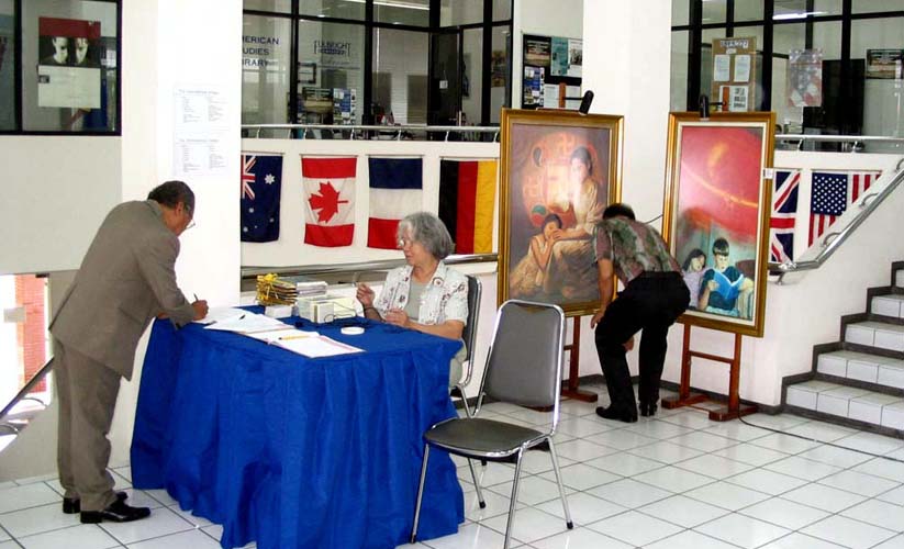 纯朴的泗水人为画中表现的精神所感动,仔细观看着,有些人流连忘返。参观者有国际村的西方留学生,其中有一位用相机把画面认真拍照下来;也有从中国来的访问学者。参观后,有法律专业的学生希望与学员另作专题研讨。