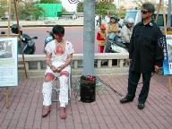 会场上最令人震撼的就是真人模拟的酷刑展示,展出的包括灌食酷刑、、奴工、吊刑、钉竹签、烙刑等,以及其它酷刑的图片展。事实上中共江氏集团非法迫害法轮功学员所使用的酷刑多达一百多种。这些酷刑展吸引了民众的围观,当他们在听到法轮功学员的详细介绍后,许多人主动签名支持反迫害,直说太残忍了,有的家长了解真象后,逐一介绍给她的孩子,主动当起传播真象的一员。整个场中人来人往,络绎不绝,走了一批又来一批。可以看到很多人看到真象后再听到学员解说时,都红了眼眶,流下眼泪。当法轮功学员们将正在发生的残酷手段予以曝光时,许多民众的正义和良知一个个苏醒。