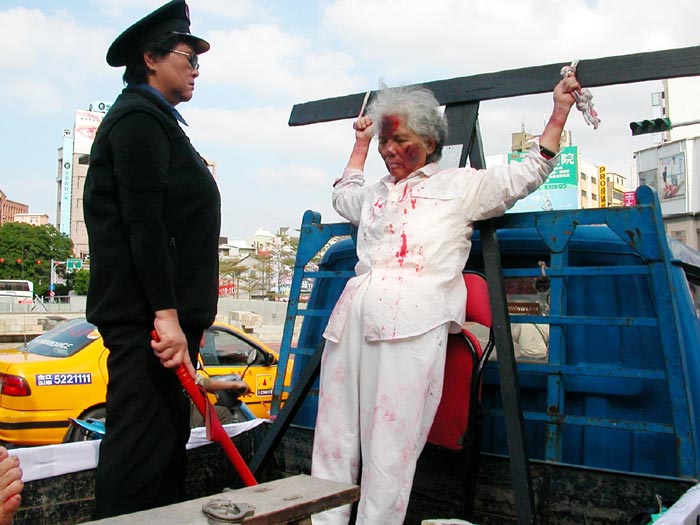 【明慧网2004年12月22日】1999年7.20起,中共江氏集团开始非法镇压法轮功至今已经5年多了。法轮功学员为了让更多人了解这场非法的严重及残忍,于12月18日在台湾新竹市东门圆环举办了真人模拟的反展并举行了记者会,希望藉由这样的方式呼吁及早停止这场非法迫害。