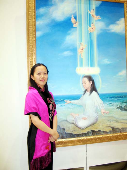 《天人合一》是来自她心中最美好的一段记忆,她初学法轮功,习炼打坐,是在一个小岛,之后就常去海边炼功,那种人与自然、海天浑然一体的感受,美妙而真实,所以,她就用画笔将之记录了下来。