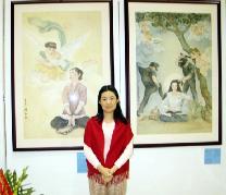 ![]() 艺术家樊弘女士和她的两幅展出工笔画 |