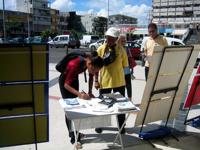 学员们借此机会向人们讲述了发生在中国大陆的法轮功学员所受到的迫害,人们为所看到的、在现如今还存在着如此残酷的行为而惊呆了,特别是这种野蛮行为是由当权者系统性的在全国范围内做出来的。越来越多的瓜德卢普人知道了在中国江氏集团对法轮功的迫害事实并签下自己的名字反对这场迫害。
