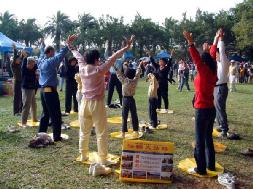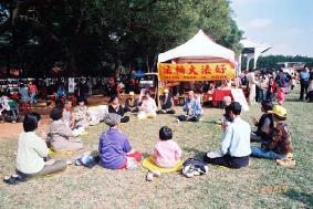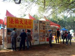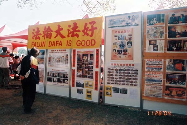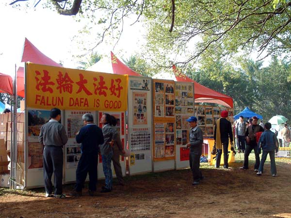 活动当天,阳光普照,摊位的旁边正好有 一片绿油油的草地可供演示功法,来往的人潮络绎不绝,一进会场可看到许多“法轮大法好”的横幅。 十几位法轮功学员有的发资料,有的表演功法,其中还有几位可爱的小弟子,表演起功法来,动作一点也不含糊。学员们热心的义务洪法炼功,主要还是希望游客们不要错过难得的机缘。有的学员跟来宾分享学炼法轮功后身心提升的心得;很多人主动来到摊位前索取相关的真象资料和光碟; 有的人在一旁也跟着学炼功法的动作;还有的说以前炼过只是没看过《转法轮》,法轮功学员亲切的和他分享真善忍等修炼内涵及书中珍贵的法理,并将《转法轮》一书送给她;有的民众说在暖暖的阳光下看学员们祥和的炼功感到非常优美与舒服;还有一位资深的员工在一旁默默的看着,并表示退休后一定找学员学炼功法。