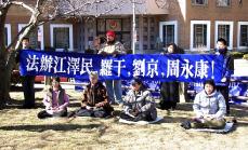 华府法轮功学员于2004年2月13日中午在中国驻美国大使馆前举行新闻发布会,并且打出“法办江泽民、罗干、刘京、周永康”,“严惩江泽民”,“道义法庭、人心法庭、人间法庭全球公审江泽民”等横幅。