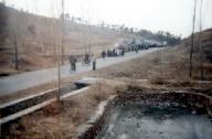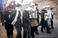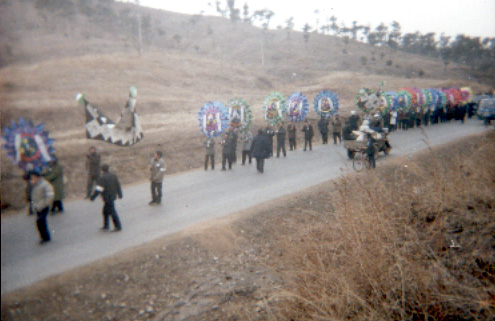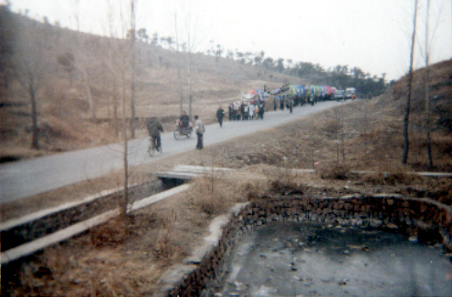 起灵了,前面是宋友春生前和死后形成鲜明对比的两张巨幅照片,紧跟其后是160多名大法弟子手举53个花圈、六个大幛子排成两行长队,最后是家属、亲朋好友、乐队奏着哀乐、吹着喇叭。大法弟子们高喊着:“法轮大法好,法轮大法是正法!宋友春是被迫害致死的,严惩凶手。还师父清白。”等口号,有的前来送灵的乡亲们和小孩也跟着喊了起来,喊声响彻云霄,响彻寰宇,惊天动地。