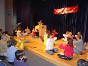 庆祝仪式的会场布置得庄严而祥和。主席台正前方悬挂着“法轮大法”和“真善忍”的横幅。在会场外,摆放着法轮大法简介和各类讲清真相的资料及展板。