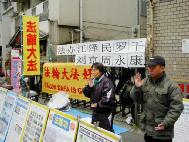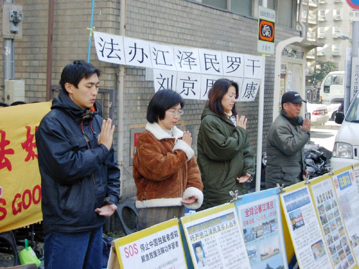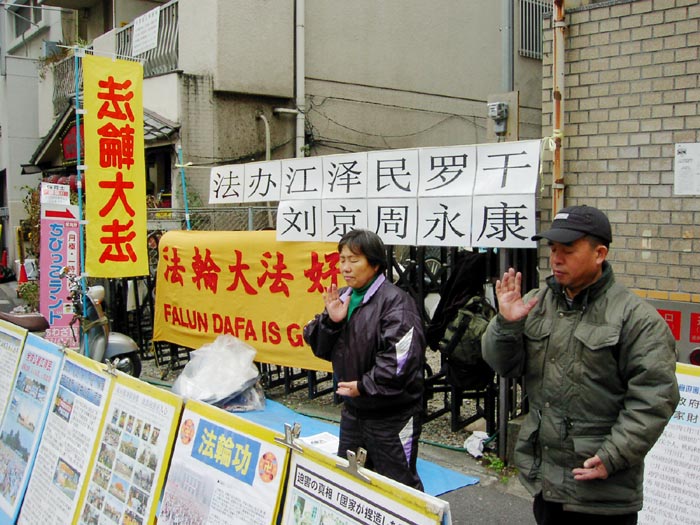 随着对在日华人讲清真象的不断深入,坚守在领事馆前请愿的学员发现,真的是越来越多的华人开始明白了这场迫害的严重性和残酷性。在学员们请愿之际,有不少中国人刚从领事馆办完手续出来后就主动过来索要真象资料。有一位知识分子模样的中年人一出领事馆便径直走到学员们的请愿之处,索要真象资料。他一边翻看着资料,一边说:“我并不太了解法轮功,但我坚决反对政府这么竭尽全力地打压法轮功。”学员一边为他有这样的正义感而高兴,一边纠正他说:“不是中国政府在迫害法轮功,而是江泽民等一小撮人利用手中的权力打着中国政府的名义在进行迫害。而我们现在也在要求将江泽民、罗干、刘京、周永康等迫害元凶绳之以法。”