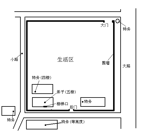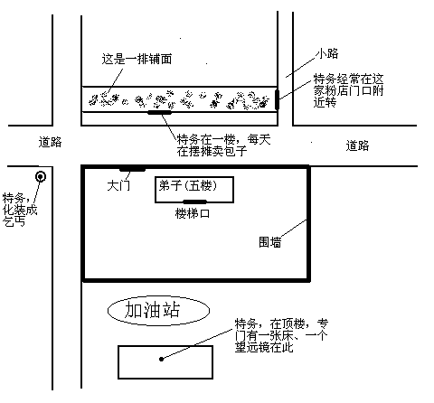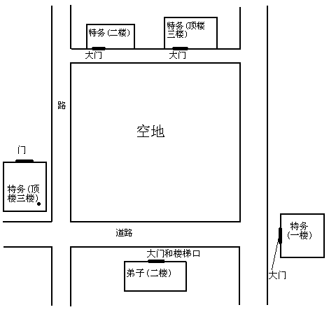 以下是南宁市三位被不法人员列为“重点监控对象”的大法弟子的住所被监视情况的示图。从图中可见,坏人蹲点的位置一定是在正对楼梯口和大门的地方。针对坏人的非法监控,大法弟子应当有针对性地发正念破除干扰。