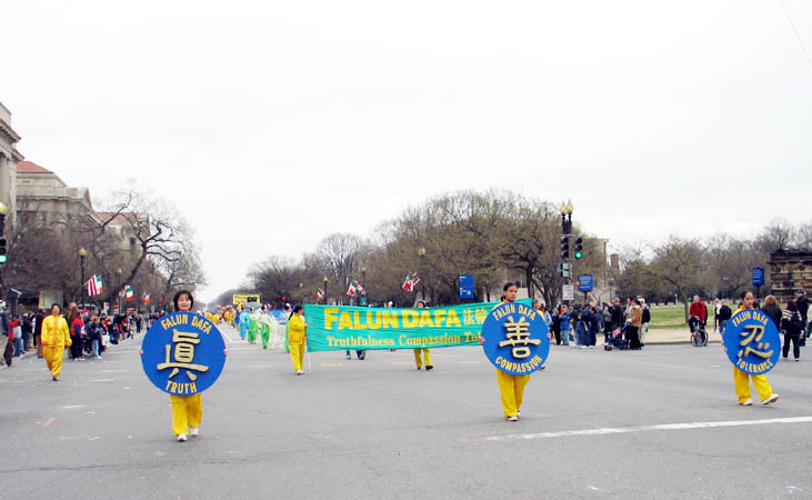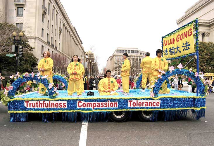 当法轮功队伍通过主席台时,主持人热情地向观众介绍:“法轮功以真善忍为原则,是一种身心修炼之法,自法轮功1992年传出以来,已遍布全球60多个国家,让我们以热烈的掌声感谢他们精彩、优美的表演。”