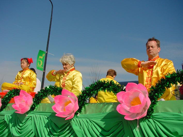 | 花车上的功法表演 | 法轮功游行队伍 |