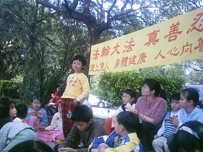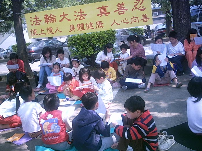 在台湾,春天明媚的季节,法轮功小弟子得以在荫凉的树下读书学法;得以天真无邪地和同伴嬉戏;及彼此鼓励做个符合“真善忍”的好人。然而在中国大陆,由于江氏集团的残暴无耻,至今还在持续地上演一幕幕迫害“真善忍”的荒唐丑剧,广大的百姓遭受谎言的蒙蔽,成千上万的法轮功学员被酷刑虐杀、被非法对待,或被迫四处流离失所,无家可归;还有许许多多本该是天真无忧的孩子们,因江氏集团谎言的宣传灌输而对“真善忍”怀有仇视。他们应该是国家未来的栋梁之才啊,如此摧残民族幼苗的纯真心灵,何其忍心啊?