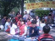 户外集体炼功也是不可少的活动。既让小弟子们炼了功,又可以帮助有缘人认识大法。小弟子们有序地排好队,一路浩浩荡荡地走到篮球场旁,在太阳底下有板有眼地盘起腿来。虽然那天太阳很大,小弟子们个个汗流浃背,但大家都能坚持到结束。