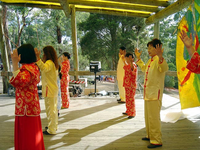 下午,功法表演队伍来到主舞台上向观众展示了五套功法。整齐的功法动作配上带有介绍法轮功的大法音乐让这次功法表演显得格外别致与优雅。