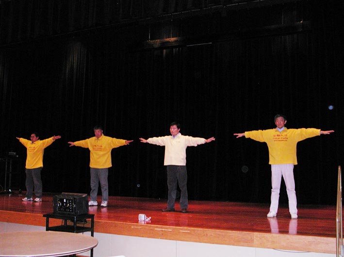 | 学员们在舞台上做功法表演 | 有缘人喜闻大法 |