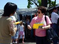 除了向游人讲清真象外,一位学员还花了近三个小时的时间走访每一位参展的摊主,并把大法简介资料送到他们的手上。每位摊主都愉快地接受了大法的资料,耐心倾听学员讲真象,并对我们义务教功之举表示了赞赏和惊讶。我们隔壁的一个摊主还邀请我们在暑假到他们的活动中心教授法轮功。除了向参展的摊主介绍大法和讲清真象外,学员还力所能及地帮助他们临时照顾摊位,接待顾客,拆卸帐篷等,所以他们都感到法轮功学员很亲切,从而使得讲清真象的效果也特别好。