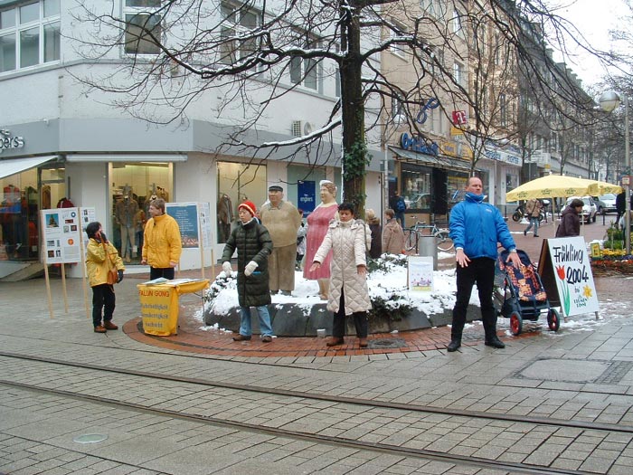 【明慧网2004年3月4日】鲁尔工业区有五百万左右人口,城市非常密集。在鲁尔区法轮功学员们已经在埃克零豪森(Recklinghausen)、波鸿(Bochum)、多特蒙德(Dortmund)、杜伊斯堡(Duisburg)等城市举办过介绍法轮功真象的信息咨询日。2月28日,学员们在维藤(Witten)市再次向公众讲清真象。