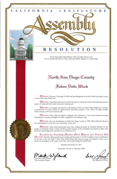 州议会众议员马克-威兰德(Mark Wyland)和参议员比尔-默洛(Bill Morrow)非常高兴地和人们一起庆祝北圣地亚哥县的首届法轮大法周,并鼓励这个地区的居民出席并参加在这个特殊的时候举办的很多活动。