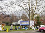 在2004年2月24日来自波恩、科隆、法兰克福、海德堡和达尔姆市的修炼者在驻波恩的中领馆前聚集,他们在此平和地炼功并向路人分发讲清真相的传单。