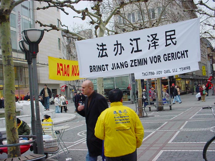 2月21日在法兰克福市中心举行了法轮功信息日。在树之间分别悬挂着四幅写有那些主犯名字的横幅。横幅前,法兰克福炼功小组展示着祥和流畅的功法,如果在中国这样做肯定是会被捕的。这个炼功小组向人们解释江泽民集团及其追随者在中国所犯的罪行。一个大型展板上清楚地展示着许多照片,那些是在这四年半内因学炼法轮功而在警察局和劳教所中被那些受国家支使的人,以非人的手段迫害、酷刑致死的人。