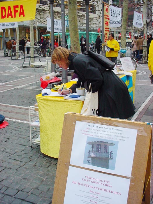 【明慧网2004年3月8日】“我可以在哪儿签字?”--这是我们在德国法兰克福信息日中经常被问的一个问题,签名的人很多。行人们以签名来支持我们将中国迫害法轮功的元凶送上法庭。